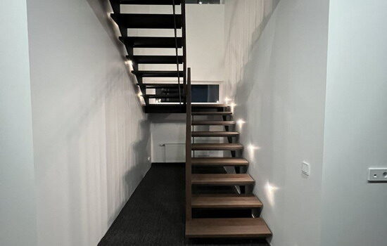 При обшивке металлического каркаса лестницы использовался дуб, покрашенный в цвет тёмный орех. При изготовлении ограждения использовались металлические балясины и дубовый поручень. Проект был выполнен в а.г. Колодищи, Минского района.
