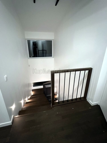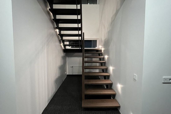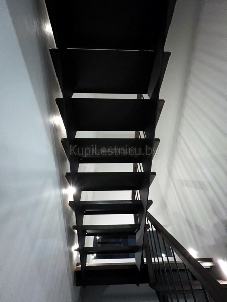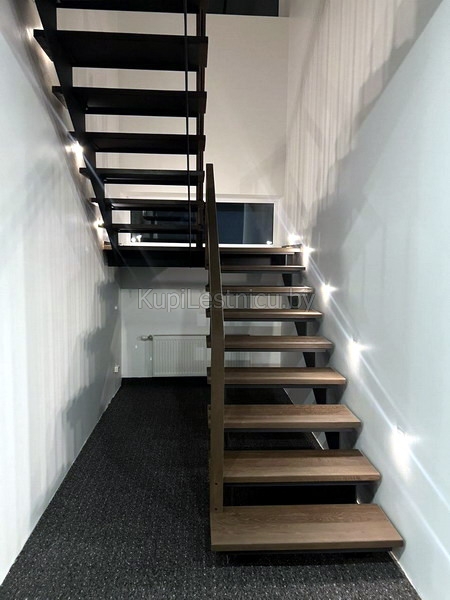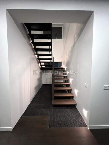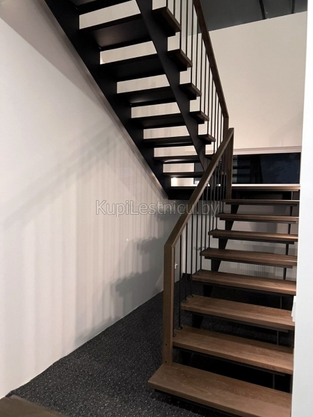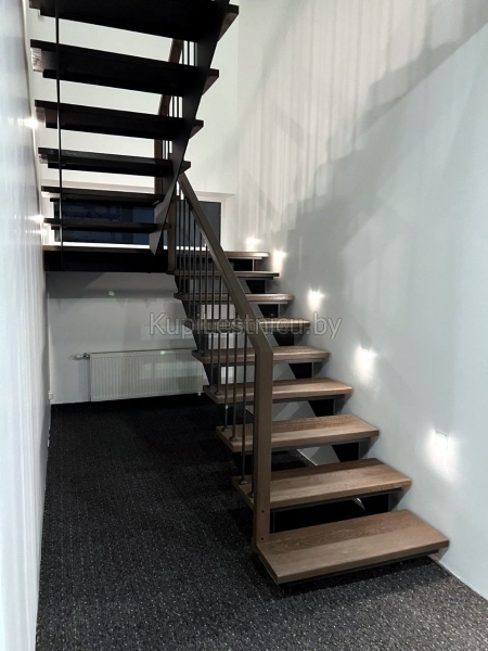 При обшивке металлического каркаса лестницы использовался дуб, покрашенный в цвет тёмный орех. При изготовлении ограждения использовались металлические балясины и дубовый поручень. Проект был выполнен в а.г. Колодищи, Минского района.