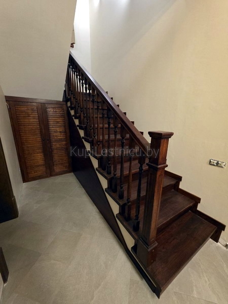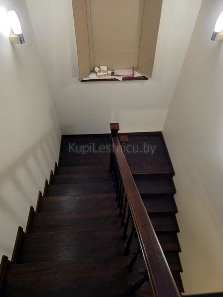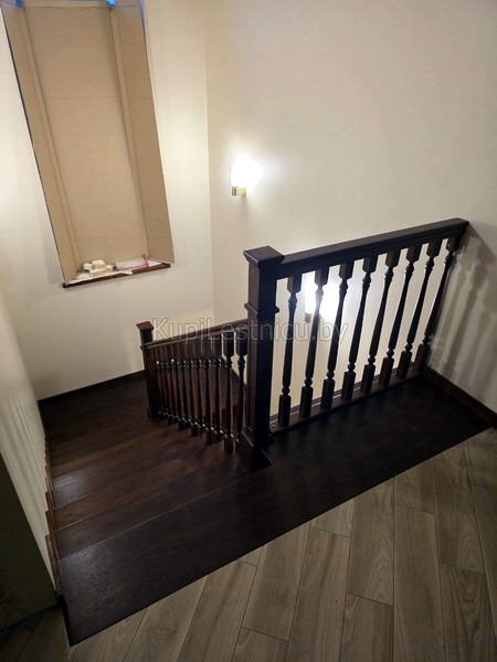 При отделке бетонной лестницы использовался дуб, покрашенный в цвет тёмный орех. При изготовлении ограждений использовался также дуб с дизайнерскими столбами. Проект был выполнен в д. Дуброво, Логойского района.