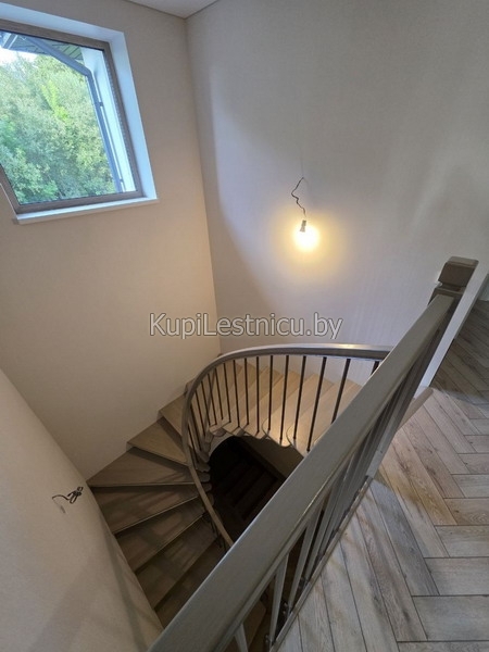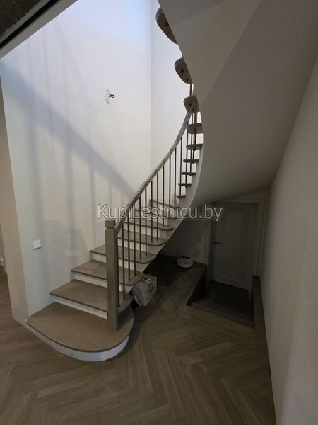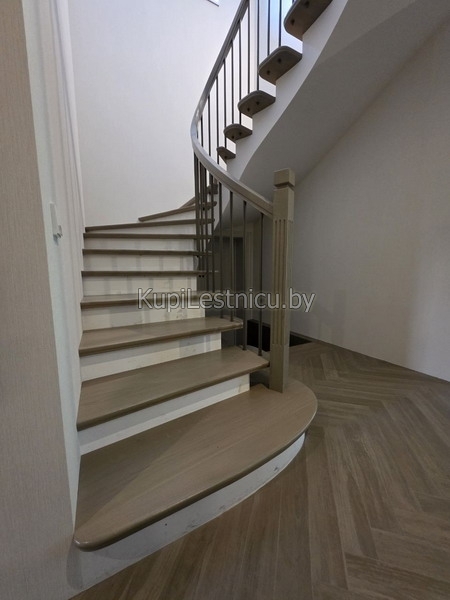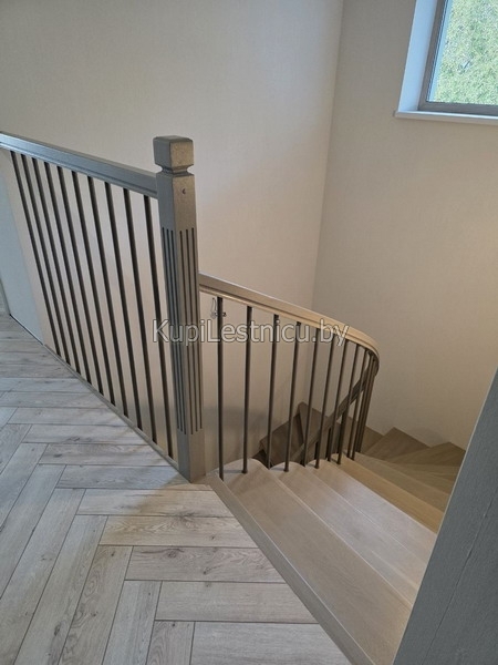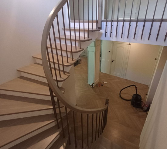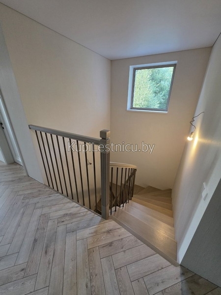 При отделке бетонных ступеней лестницы использовался дуб светло-коричневого оттенка с легким желтоватым подтоном (канадский дуб). При изготовлении ограждений использовался металл с поручнем из гнутого дуба. Проект был выполнен в городе Минске.